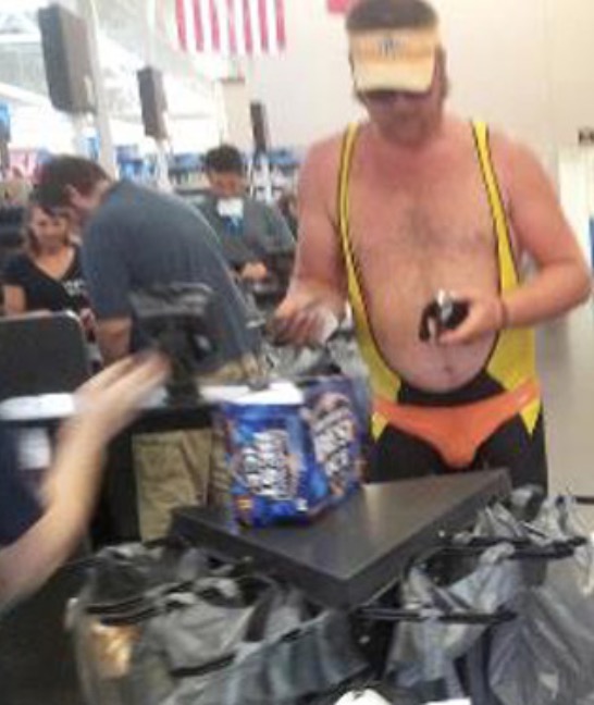 This is something you don't see too often. The man is buying beer at Walmart and he's wearing a suit for professional wrestling.