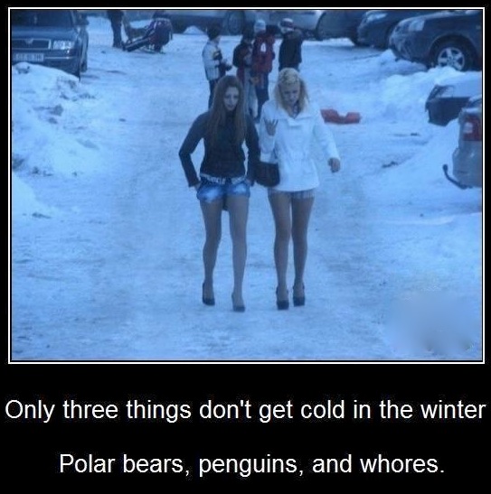Funny how only three things don't get cold in the winter. Polar bears, penguins and whores. It's seems the colder it is the shorter their skirts.