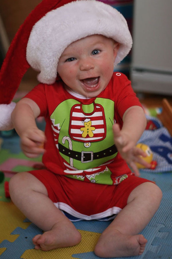 This kid finally got everything he ever wanted for christmas: a goofy looking outfit and a chance to be one of Santa's little helpers. Damn he's excited.