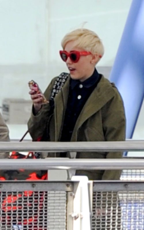The “We Can’t Stop” singer checked her mobile phone as she walked along the dock, sporting an army green jacket and red sunglasses.