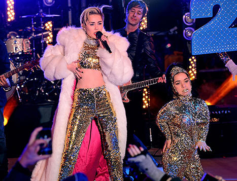 During her appearance in New York City at Times Square for New Year's Eve, Miley didn't disappoint the crowd with her appearance that evening. The "Wrecking Ball" singer stepped out wearing a shimmery gold crop top with matching pants and a really long and heavy looking white fur coat. While dancing, she briefly showed the pink lining inside her fur coat. During a pre-interview with Ryan Seacrest, three of her dancers were shown holding up the coat so it won't touch the ground. The singer performed her hit singles "Wrecking Ball" and "Adore You" to the waiting crowd. We hope that she wore that white fur to avoid the chill (Miley has been under the weather lately) but she better watch out for PETA activists soon.