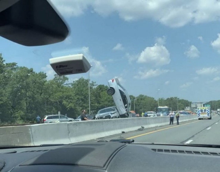Minor fender bender here. It looks like it's balanced on the front bumper.