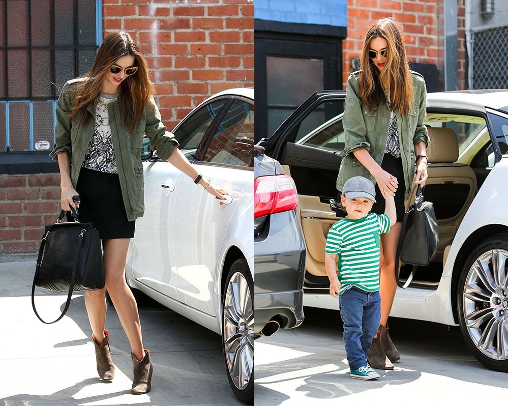 Miranda Kerr supermodel held onto her son Flynn’s hand while donning an army green jacket, black mini skirt, and Miu Miu Catwalk sunglasses.