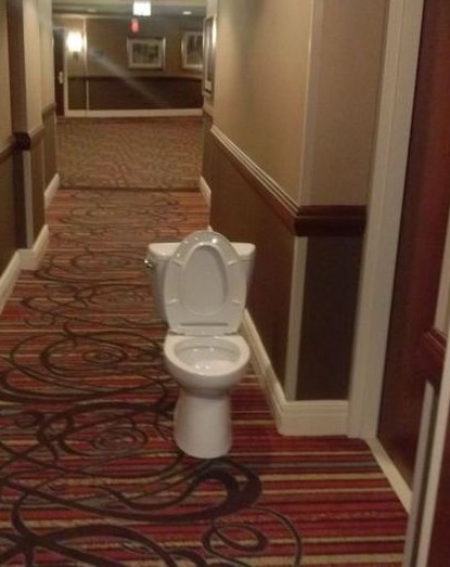 This toilet seems to be out of place, don't you think? Something tells me that it shouldn't be ever placed in the hallway.
