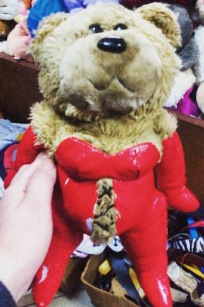 It looks like this teddy bear definitely has other things on her mind vs being soft and cuddly. This is the perfect gift for most couples.