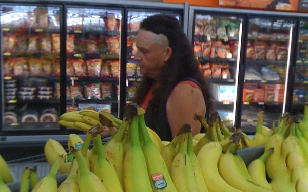 This haircut fits nicely among the bananas because you have to be a clown to wear such a hairdo. Well, if you've got it flaunt it I guess. Mohawk mullets...only at Walmart!
