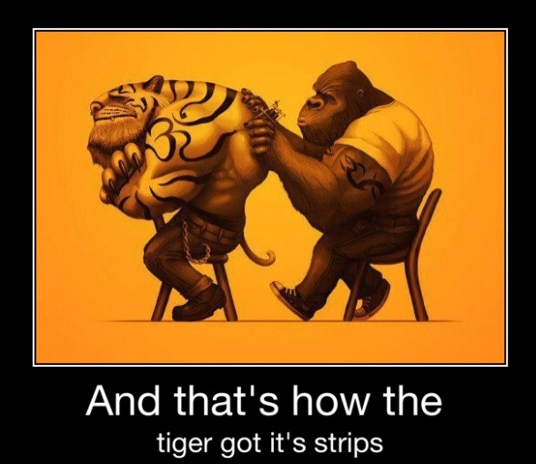 Well son he met a giant gorilla and that's how the tiger got it's strips