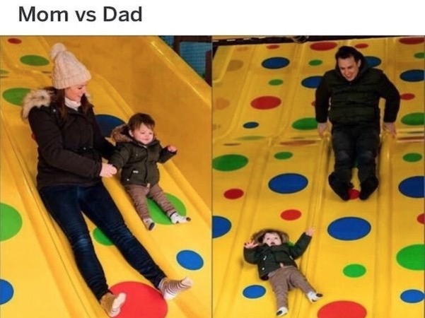 This mom vs dad going down a slide with their kid. Notice the difference?