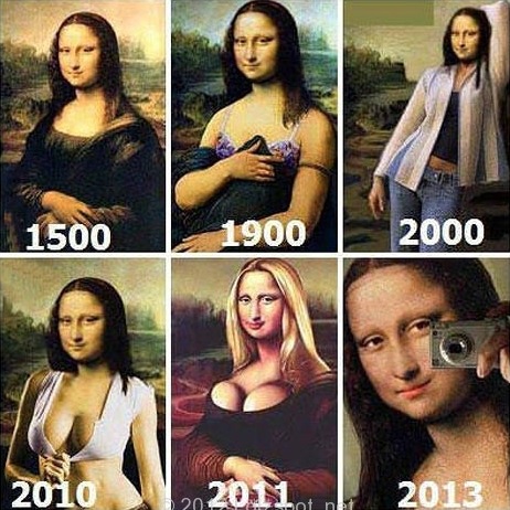 Mona Lisa throughout the ages. My how she has changed. From that enigmatic smile to busty selfies and low cut blouses. But the smile always remains the same