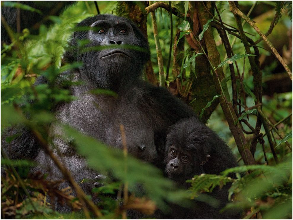 Alert to human visitors, a young mountain gorilla and its mother sit tight in Bwindi Impenetrable Park. When the park opened in 1991, villagers resented losing access to forest where they had gathered honey and wood. Today the park shares the fees from gorilla-watching tours with the locals, a small victory in the Albertine Rift's unending clashes for livable space.