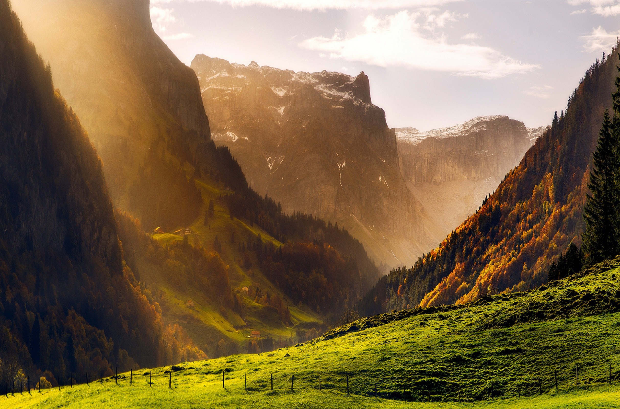 Amazing view of the mountain side. Green grass brings out the Spring feeling, and at the same time the snow on the mountain still makes it feel like its Winter. This would defiantly be somewhere I would love to live.