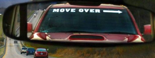 You are driving and all of the sudden you see this the car behind you has a sign on the front windshield MOVE OVER with a arrow pointing the the side.