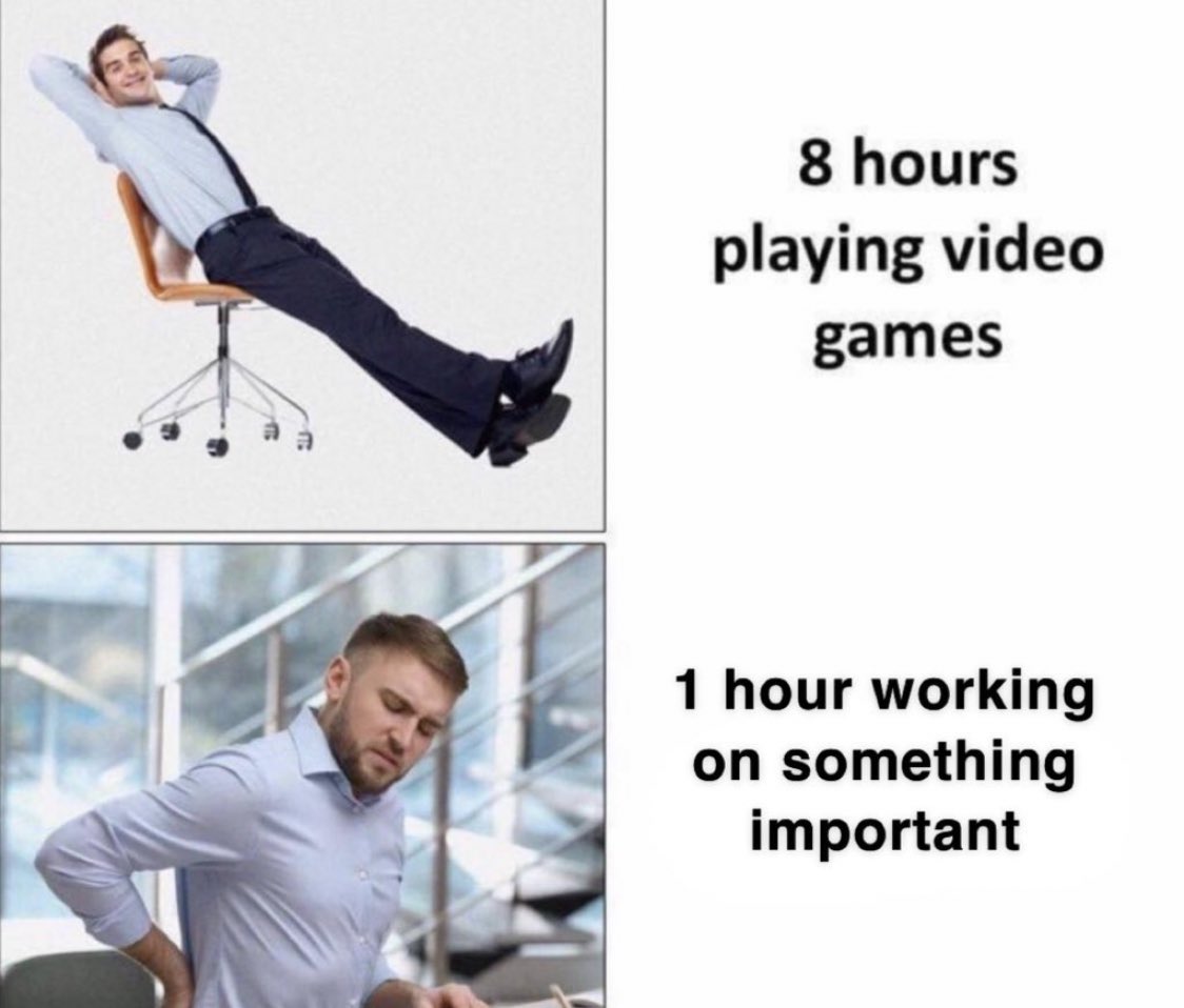 I can spend 8 hours playing a video game no problem but 1 hour on something important and massive back pain.
