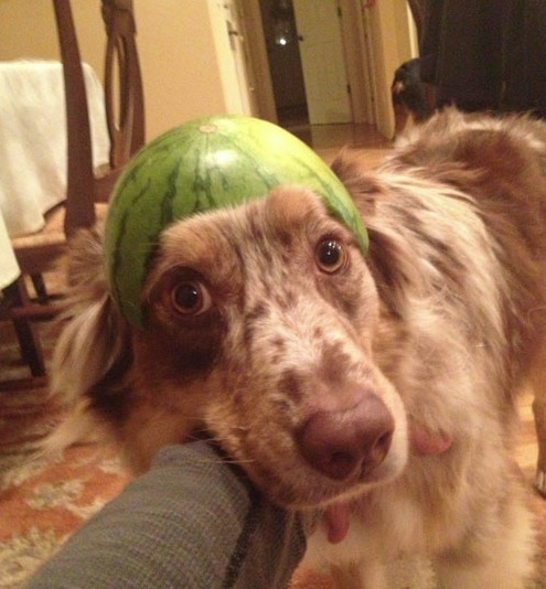 My dog just loves his new melon hat although he's not quite sure what to do with it. I think it fits him well. He's ready for any situation requiring head protection by a giant fruit.