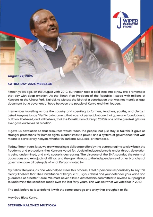 My Fellow Kenyans, as one who helped steer this process, I feel a personal responsibility to say this clearly: I believe that The Constitution of Kenya, 2010, is your shield and your defender, your voice and guarantee of a better future. We must never allow a dictatorship committed to reverse our progress to undermine the sacrifices made over the last forty years. This was not what we voted for in 2010.