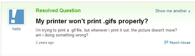 I'm trying to print a gif file but whenever I print it out the picture doesn't move? Am I doing something wrong? The printer doesn't really gif a shit but have you tried turning it off and on again?