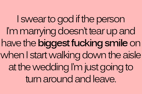 I swear to God if the person I'm marring doesn't tear up and have the biggest fucking smile on when I start walking down the aisle at the wedding I'm just going to turn around and leave.