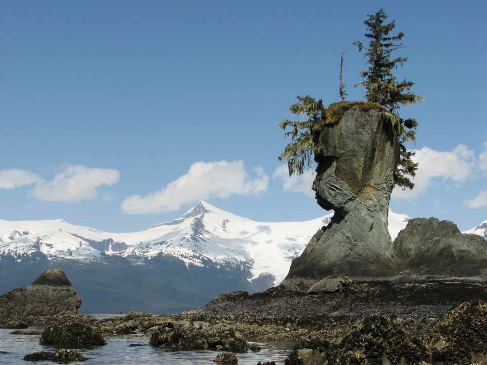 This rock formation of a face can be found among the mountainous snow capped peaks in Alaska. It seems impossible that trees would be growing on top of it.