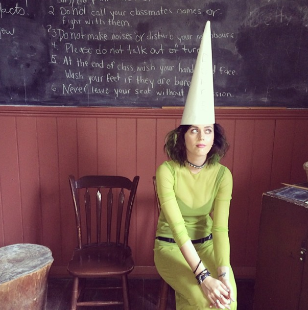 While sightseeing at Black Creek Pioneer Village in Toronto, Katy Perry was given the ultimate student punishment: wearing a dunce cap. The naughty school girl posted this photo looking none too remorseful and captioned the picture: