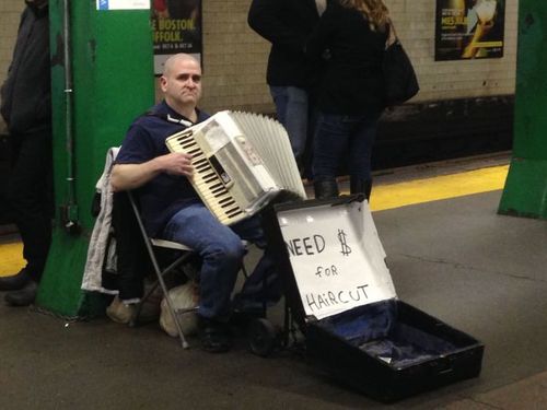 I have a theory as to why this guy isn't earning too much money. He's asking for money for a haircut but it looks like he doesn't need a haircut too much.