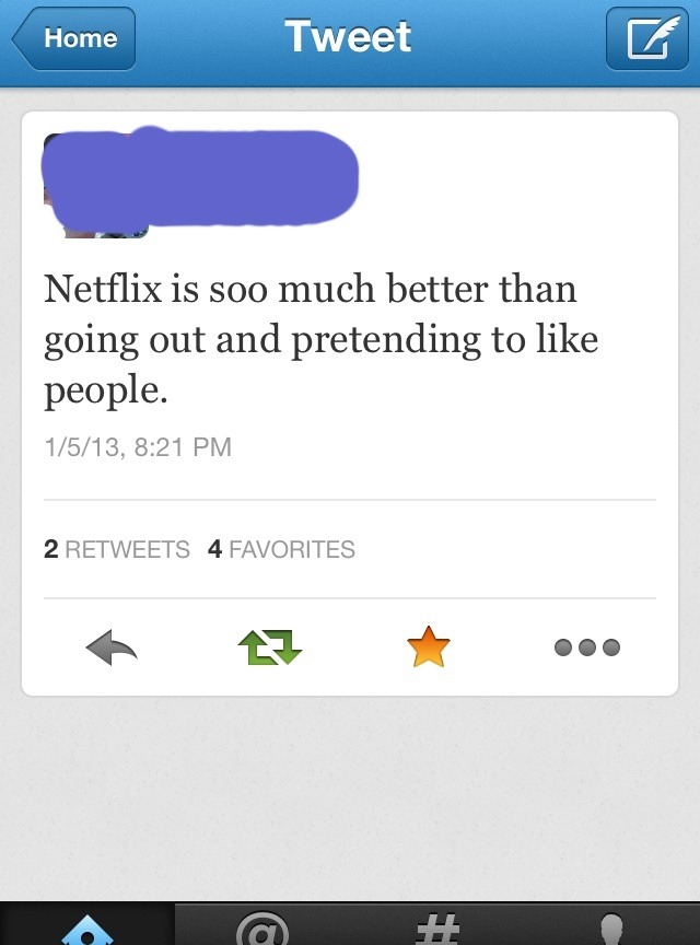"Netflix is so much better than going out and pretending to like people". Sadly this tweet is very highly relatable! Netflix has taken over my life.