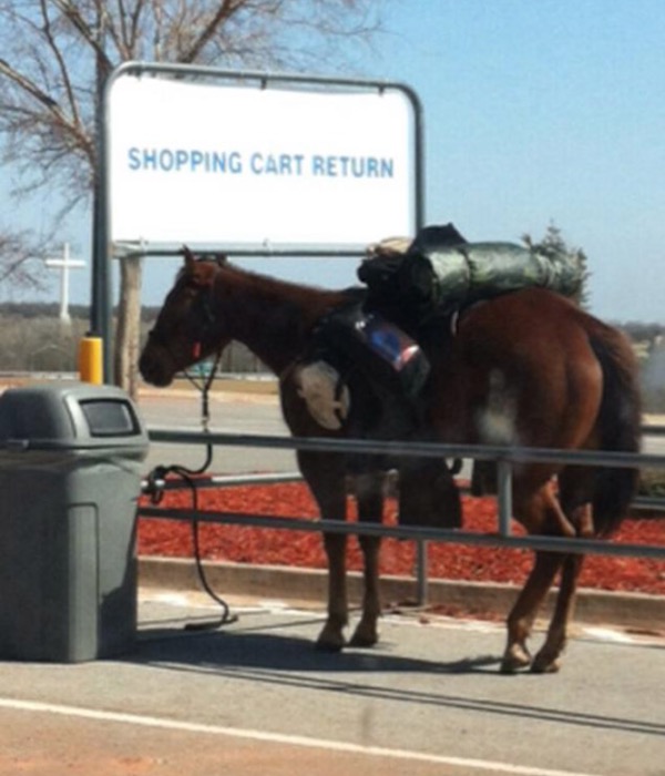 These shopping carts are way better than the old ones. Your shopping cart can ride you around and it doesn't need electricity. Remember to return your horse to the shopping cart return.