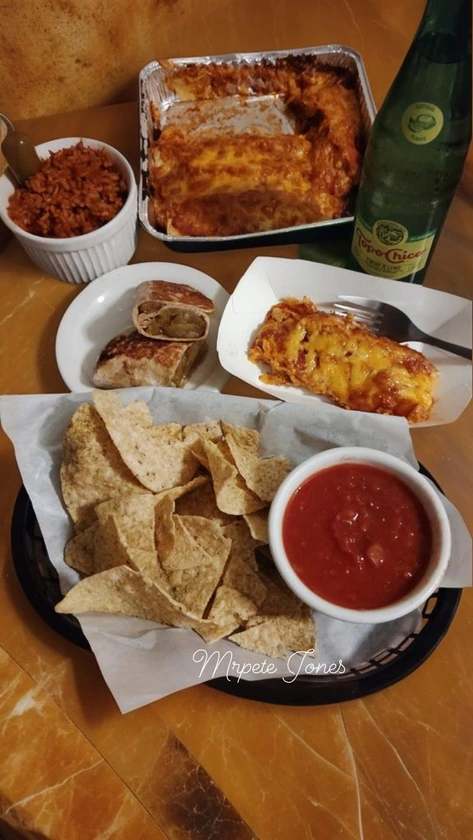 New week let's goooo 😌 y'all.Beef enchilada's Spanish rice Apple burrito(homemade )with chips and dip on a Sunday night 🌌.