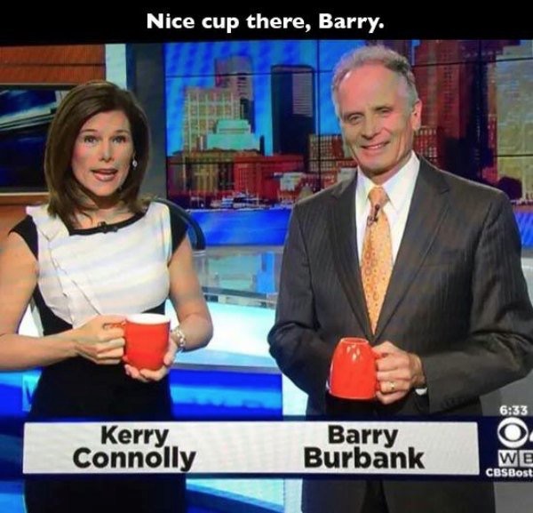 Nice cup there Barry! I would check his pants. He probably spilled it all over his nice suit. These news reporters aren't known for their high intellect.