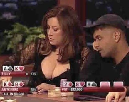 This is not what you call a poker face. You can see he is obviously wearing his feelings on his face. If only he could transplant his eyes to her boobs they'd be one.