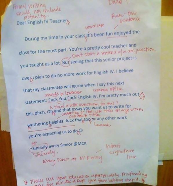 Save yourself from future embarrassment by making sure that you always proofread your work - especially when complaining to an English teacher!