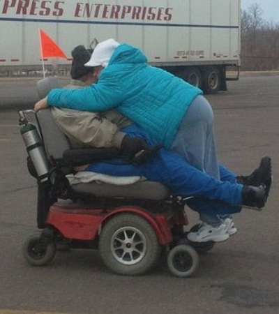 Now This is True Love. Elderly Couple Riding in Tandem on a Scooter at Walmart