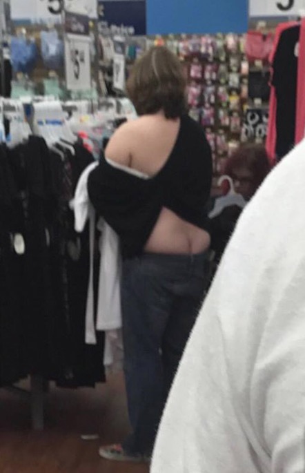 This shirt is not only off the shoulder but it's right over her butt crack. I think she's starting a new trend in fashion.