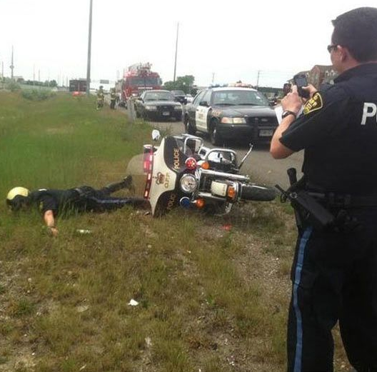 Officer on a bike went down and his partner, instead of helping him get up he pulled out the phone and started taking picture of him.