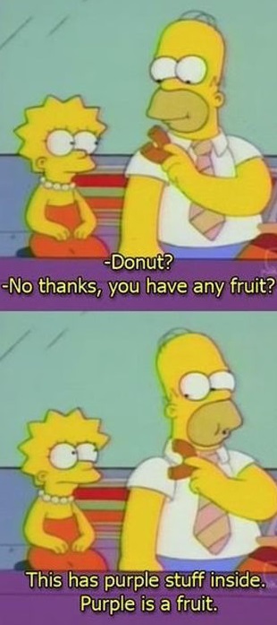 Homer has got some major studying to do when it comes to nutrition. No wonder he's so out of shape. He thinks the color "purple" is an actual vegetable.