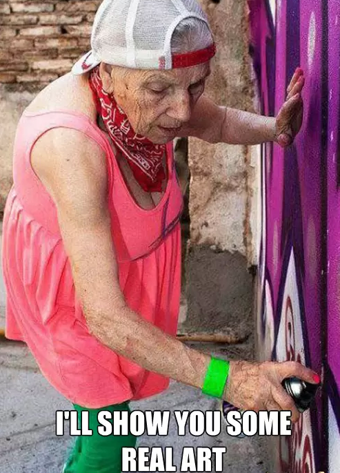 Old lady took the spray paint and she is trying to graffiti the wall, "move over little son i'll show you some real art"