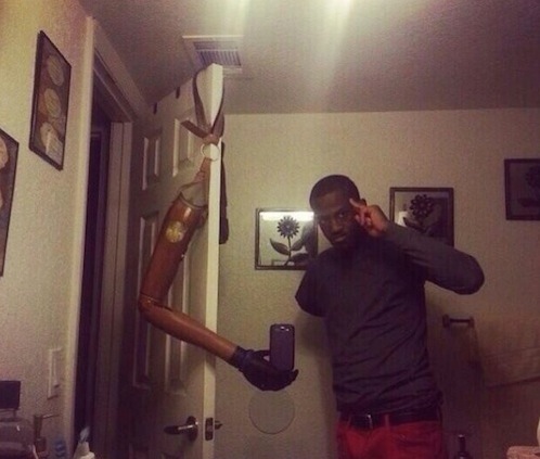 This is the coolest selfie ever. The guy has one arm and he got that arm to take a picture. Totally cool. Looks like he's a terminator or something.
