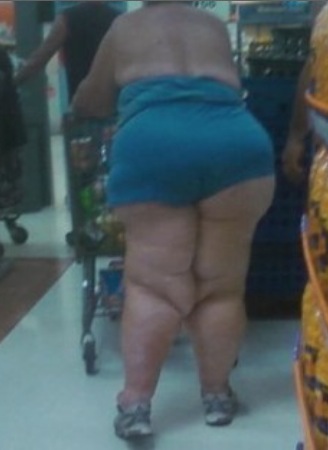 I sure hope this lady doesn't turn around. If the front is worse than the back I might toss my cookies. Get a grip woman and dress yourself decently!