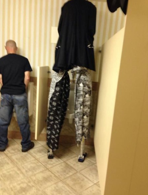 One Wrong Move By Tall Man on Stilts and Short Guy Gets a Bathroom Shower