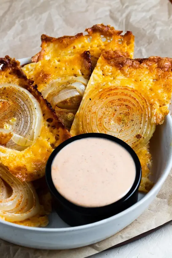 4. Bake about 15-20 minutes or until cheese is brown and crispy and golden brown. Break apart the onion chips and serve with dipping sauce.