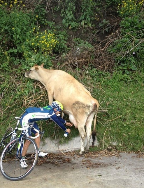 I'm all out of everything to drink and hey look a cow and maybe I should stop since I'm a mile ahead of everyone and get myself some milk.