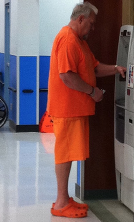What a nice orange jumpsuit. He should go to jail for looking like this. Those crocs take things too far.