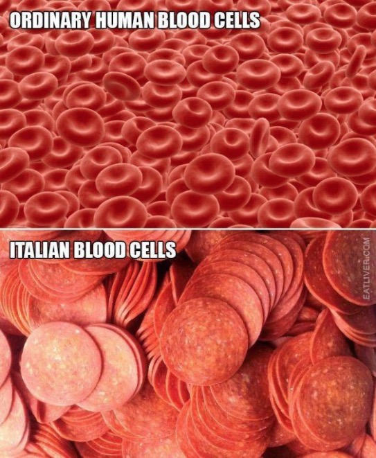 You can see the ordinary blood cells are red and red whereas the Italian ones look like pepperoni.