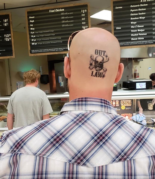 Looks like this man has sticker shock and the back of his head. Nice tattoo.