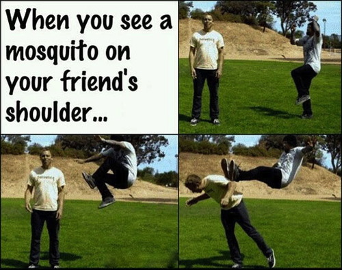 If a mosquito landed on my friend's shoulder, I don't think I would drop kick him. Although, this makes for an epic funny picture.