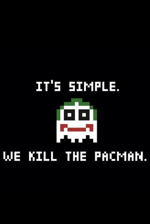 In the Dark Knight, the villain known as the “Joker” (played by Heath Ledger) appears at a gathering of Gotham’s underground criminals. After giving a short speech about Batman, one of the criminals asks what the Joker proposes they do, to which the Joker replies, “It’s simple: We, uh, kill the Batman.” Only in this case it's the video video game Pac-Man and the enemies are the ghosts!