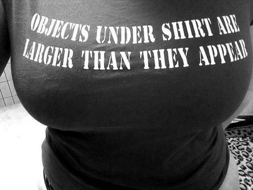 Objects under shirt are larger than they appear. It's a pair of optical illusions. Perspective!