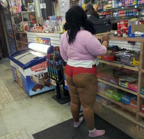 This woman must have not purchased the full set of pajamas or unexpectedly bought pajamas without bottoms and now she's looking to complete the outfit by purchasing some candy.