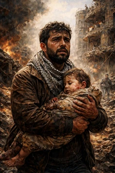 This Is A Digital Oil Painting, Of A Palestinian Man Holding His Son During The War.