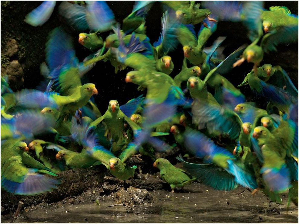 In Ecuador's Yasuní National Park, cobalt-winged parakeets flock to a pool. Scientists have identified nearly 600 species of birds in the park.