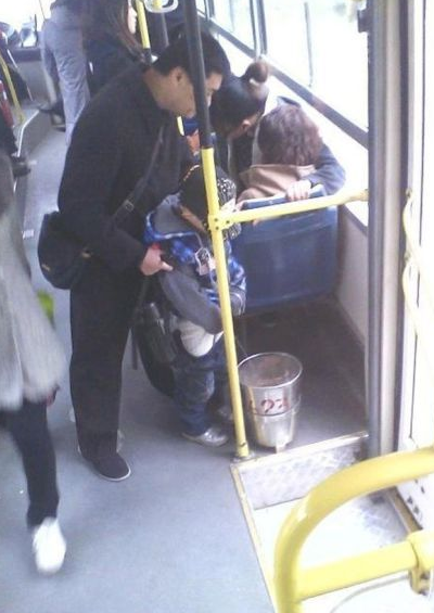 This kid was peeing in the bucket that was placed there by the driver of this bus he was tired of wiping the floor from people peeing on it